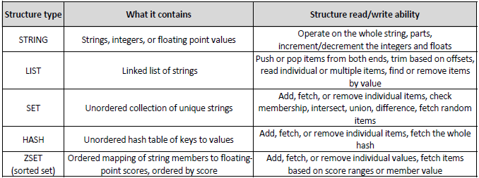 - Stores a mapping of keys to five different types of values (strings, lists, sets, hashes, sorted sets)