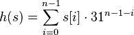 - where terms are summed using Java 32-bit int addition, s[i] denotes the i-th character of the string, and n is the length of s.